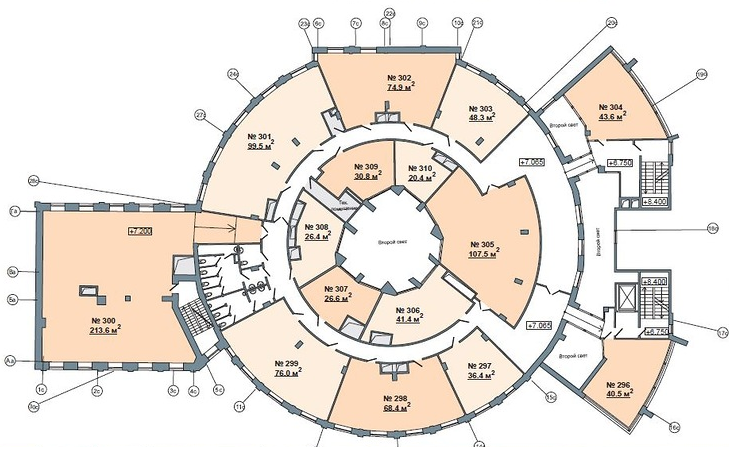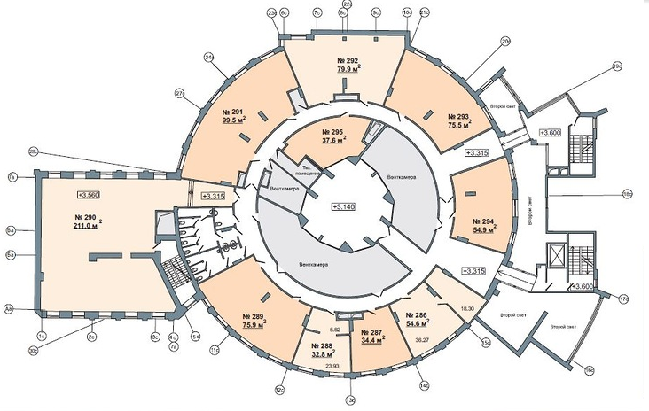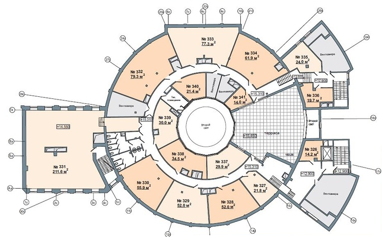 Со второго по пятый этаж здания занимают офисные помещения общей площадью 2,4 тыс. кв. м.